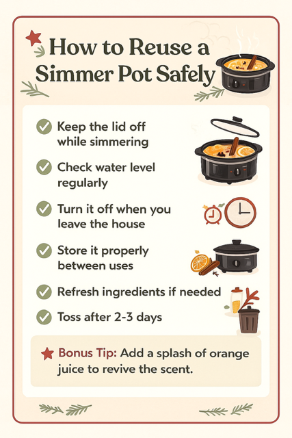 5. Reuse – You can reuse the same simmer pot for 2–3 days. Just keep adding fresh water.